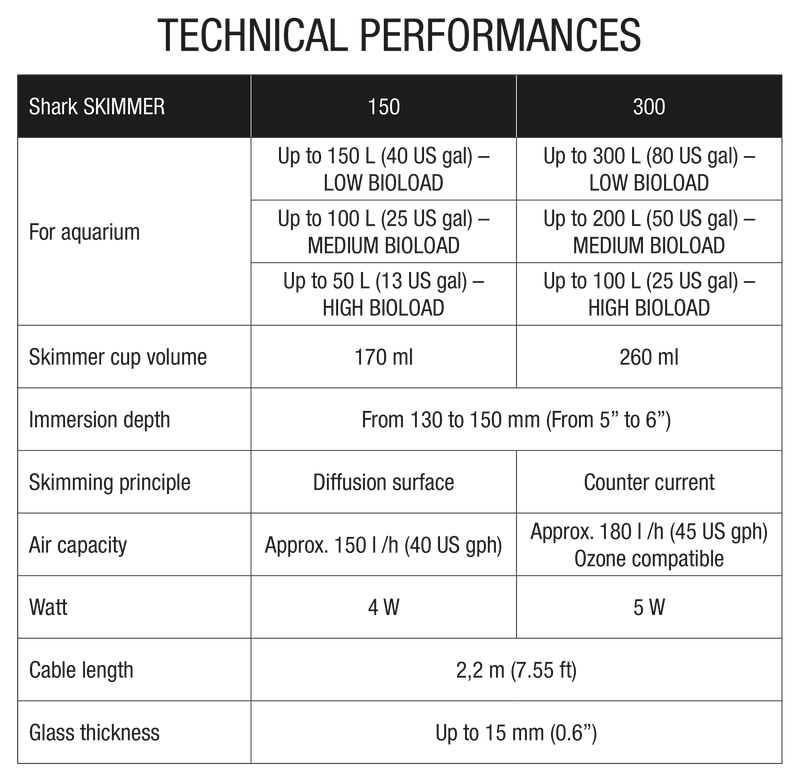 Shark SKIMMER 150 and Shark SKIMMER 300 are modern internal skimmers with a very compact and innovative Shark design for direct integration into marine biotopes. They come from the latest development and knowledge in the field of reefing and are designed for aquariums up to 150 and 300 liters, depending on the load and type of biotope. Their very low energy consumption makes them the most competitive skimmers on the market for this skimming capacity. They are extremely quiet, easy to use and easy to dismount.
