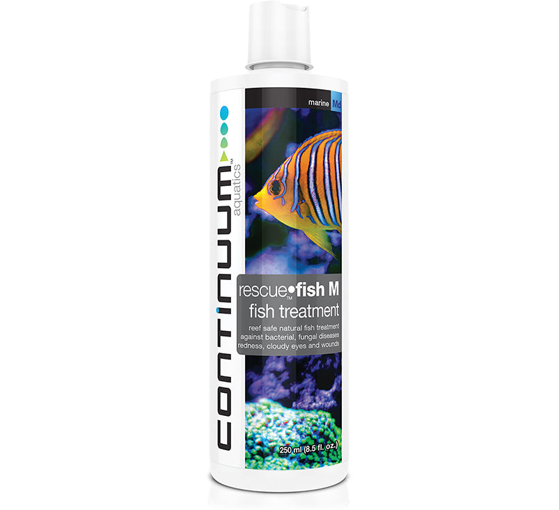 Highly effective Rescue•Fish M is designed to treat bacterial infections, open sores, ulcerations, redness in fins or body, tail and fin rot and cloudy eyes directly in the aquarium, without damaging the biological filter bacteria. It boosts the immune system of fish and helps them resist pathogens. It will accelerate skin & tissue recovery after wounds, cuts or infections. It is safe for all species of marine fish including sharks, rays eels, and seahorses and all invertebrates including soft and stony corals, anemones, mushrooms and zoas.
