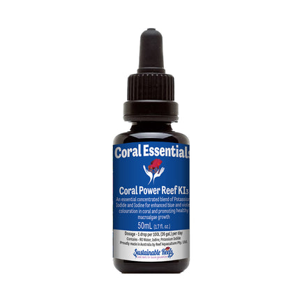 Our Coral Essentials, Coral Power Reef KI3 is a concentrated blend of Potassium Iodide and Iodine (0.5%) for marine aquariums. It is essential for healthy growth of both soft and hard coral, enhanced blue and violet colouration in corals, as well as the promotion of healthy macroalgae growth. Iodine is utilized by corals for the synthesis of pigments, which allow them to adapt to varying light conditions and provide their tissue with protection from UV radiation. To ensure healthy coral, invertebrates and macroalgae, maintain a dosing plan as detailed below. Variances above and below the recommended dosing can be made depending on your own tank conditions and density of coral present.