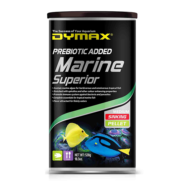 Dymax Marine Superior is made with high quality , easily digestible premium ingredients. This formula is enriched with spirulina and natural carotenoids for super colour enhancing properties combined with fresh seafood and marine algae to create a balanced diet and nutritional supplements that help improve fish health, boosts immune system function and enhances the full spectrum of the fish body colour. Contains marine algae or herbivorous and omnivorous tropical fish. Enriched with spirulina and other colour enhancing properties. Complete essentials for tropical marine fish. Flavour attractant for finicky eaters.