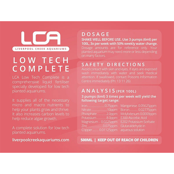 LCA's Complete Fertiliser is a comprehensive supplement specifically designed for lower tech planted aquariums and for Nano Tanks. LCA Complete Fertiliser provides the necessary micro and macronutrients (Iron/Trace, Nitrogen,Phosphorus, Potassium (NPK) for healthy plant growth, while also increasing carbon levels which aid in the reduction of algae growth.