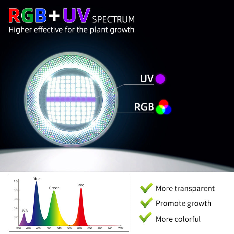 RGB+UV Full spectrum,This is a great light for giving a wide range of effects. It brings out the different colors of fish,and creates healthier light combos for plants and fish.It can promote plant photosynthesis, make the landscape more colorful abnd vivid, and make the aquarium more transparent.